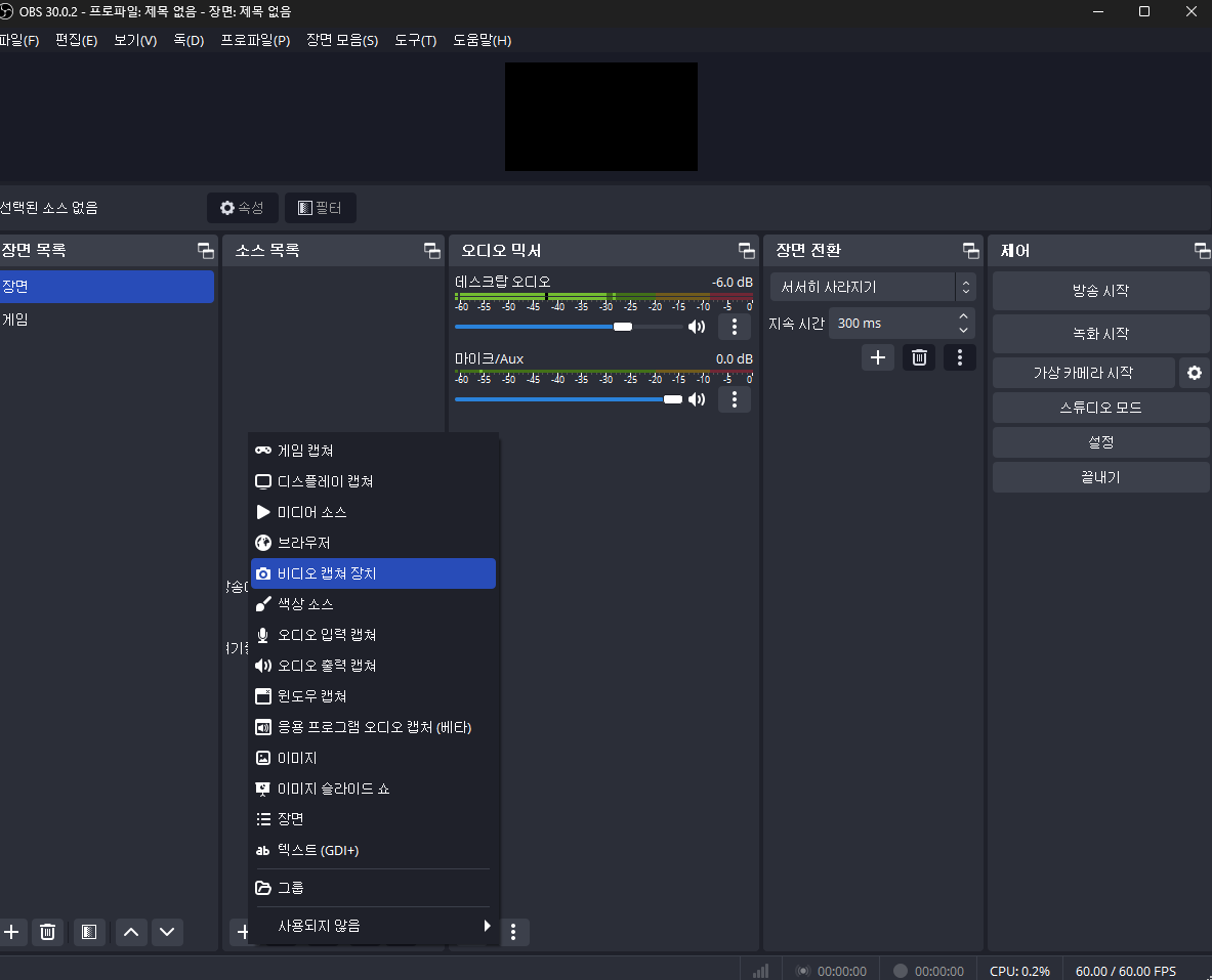 OBS 화면에서 소스목록 밑에보면 플러스 버튼 소스추가가 있다. 눌러서 비디오 캡쳐장치를 추가해준다.