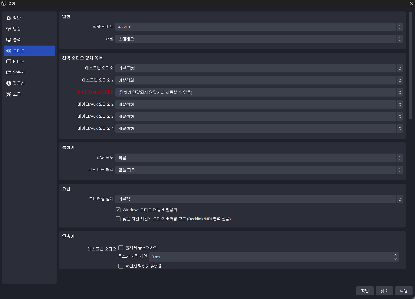 전역 오디오 장치 목록 본인 장비에 알맞게 설정