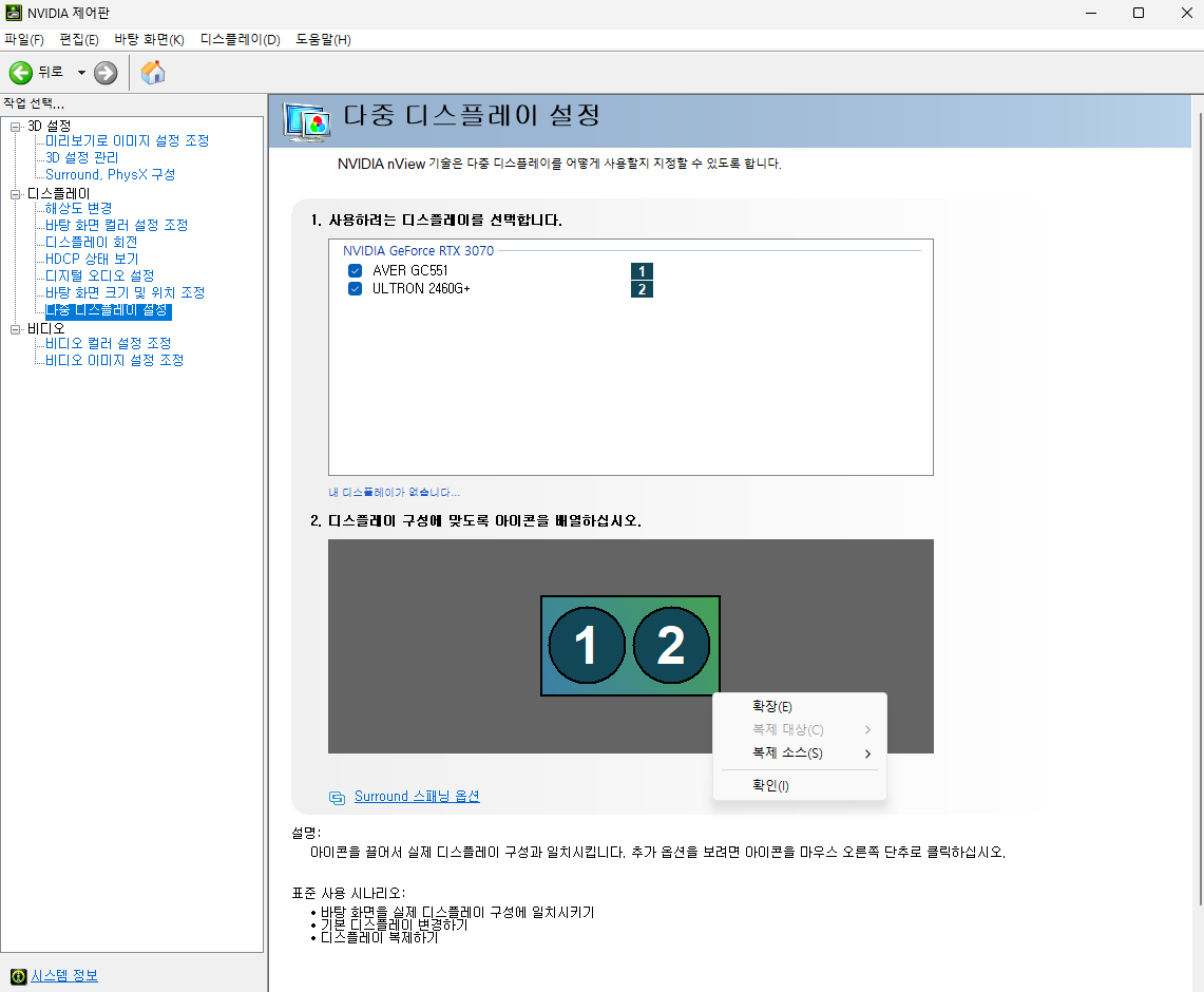 다중 디스플레이 설정 - 2. 디스플레이 구성에 맞도록 아이콘을 배열하십시오. 오른쪽 클릭 후 확장을 선택한다.