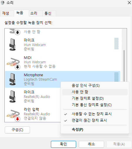 입력장치 마이크로 선택 (안 해도 된다)