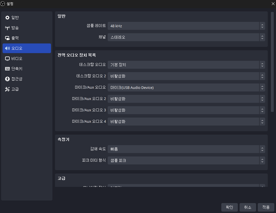 OBS 설정- 오디오 - 전역 오디오 장치목록에서 본인 장비에 맞게 설정