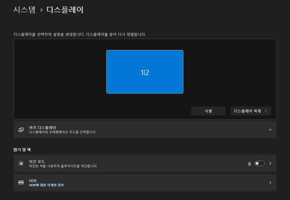 아니면 밑에 작업표시줄 검색창에 디스플레이 검색 후 디스플레이 설정 눌러주면 바로 뜬다.
