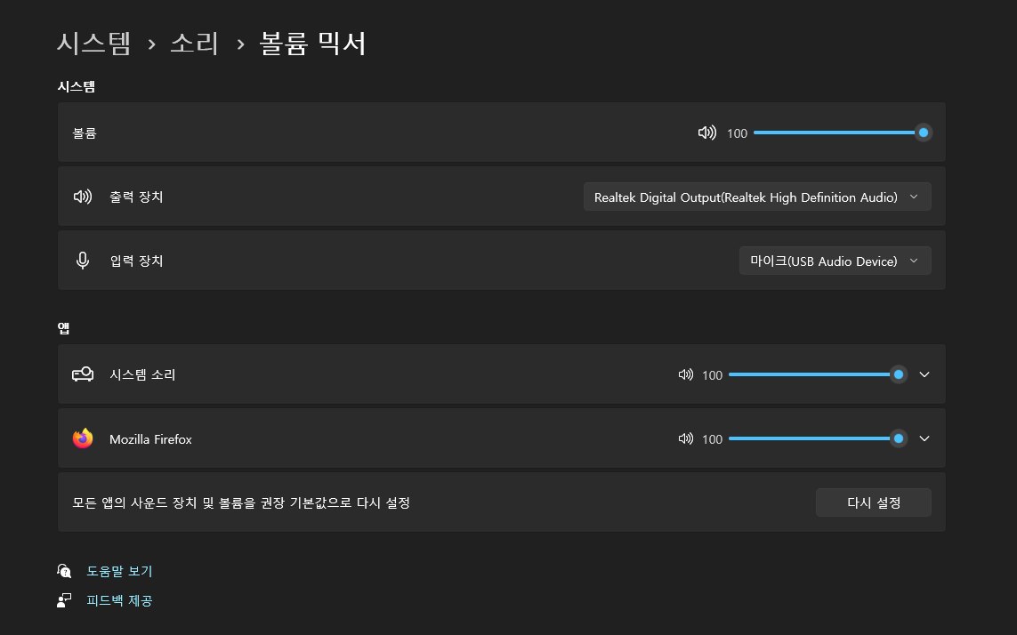 작업 표시줄 우측에 스피커아이콘 오른쪽 클릭 후 소리설정이나 볼륨믹서 열기 해도 된다.