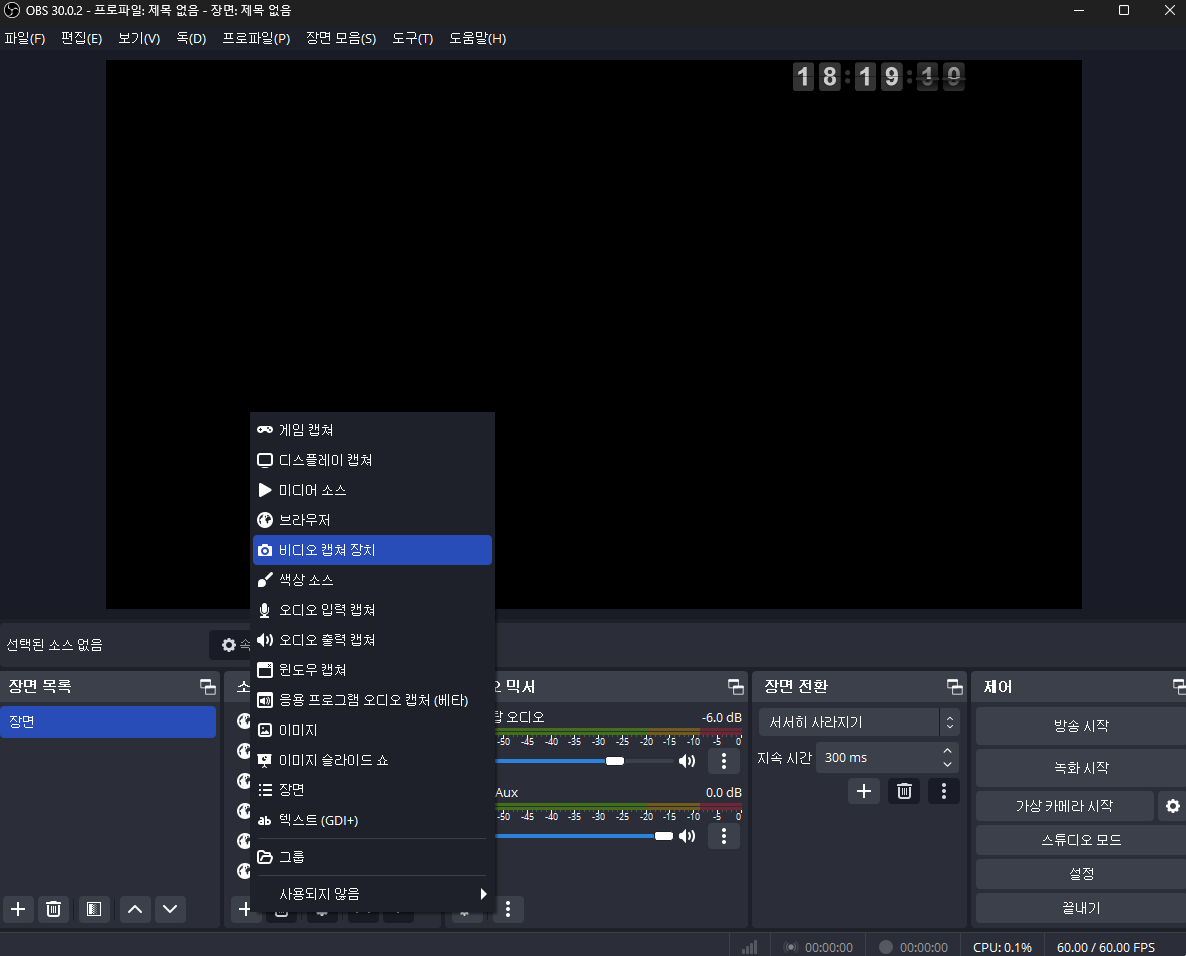 추가 후 게임 소스목록에 비디오 캡쳐장치를 추가해 준다.