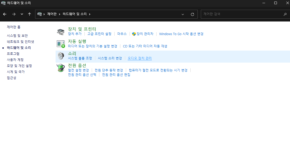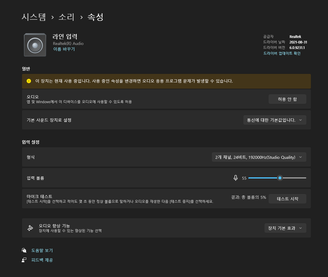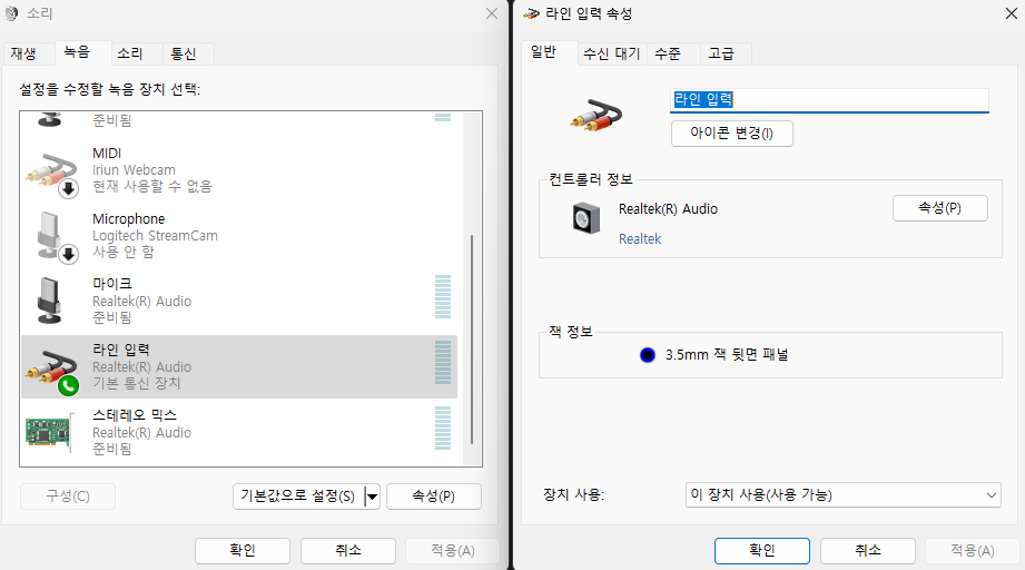 그리고 작업표시줄 검색에서 제어판 검색 - 하드웨어 및 소리 클릭 - 소리 탭에서 오디오 장치관리 클릭 - 녹음탭 - 라인입력 속성