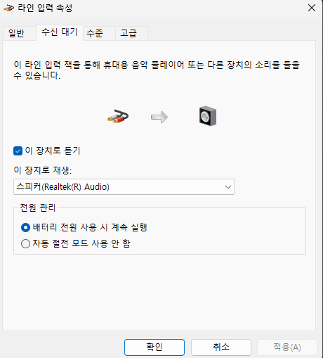 라인입력 속성에서 수신대기로 이동해서 이 장치로 듣기 체크