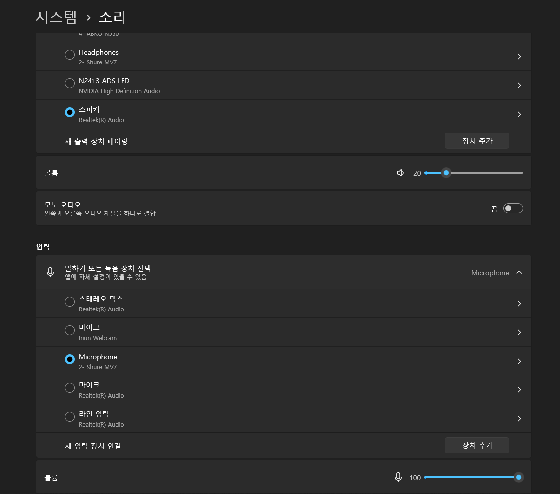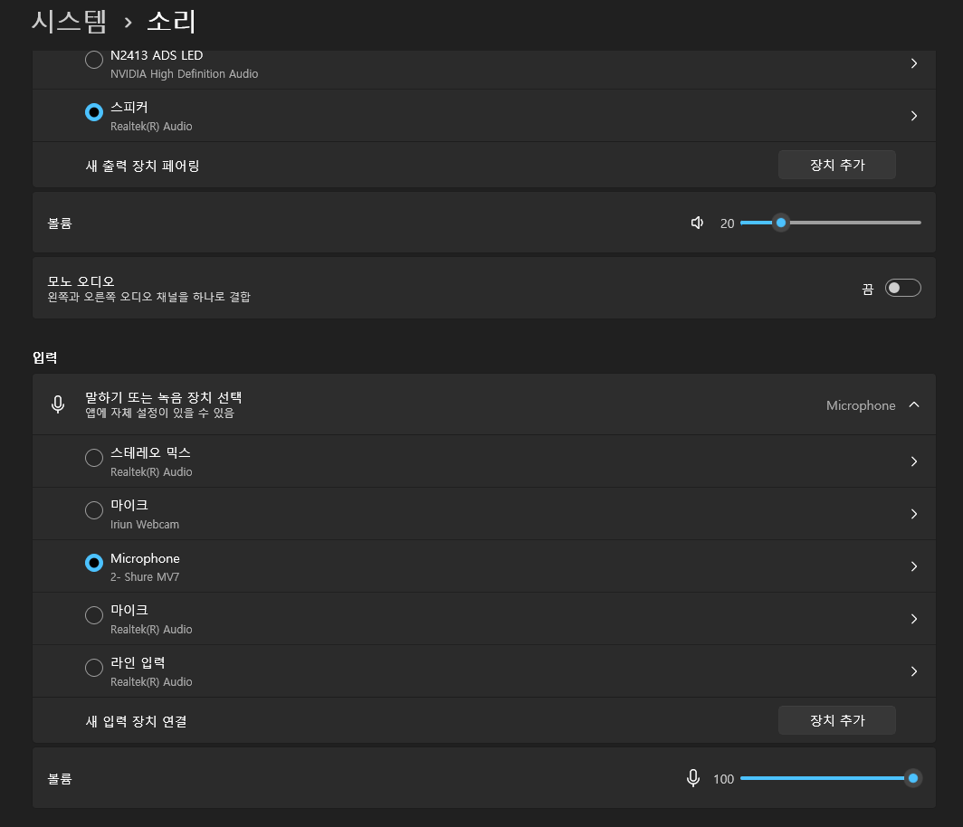 입력장치는 연결되어 있는 마이크로 설정해 준다. 하기 싫으면 안 해도 된다.