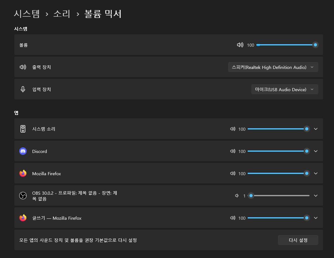 이렇게 설정을 다 하고 난 후 OBS 음량 게이지를 보면