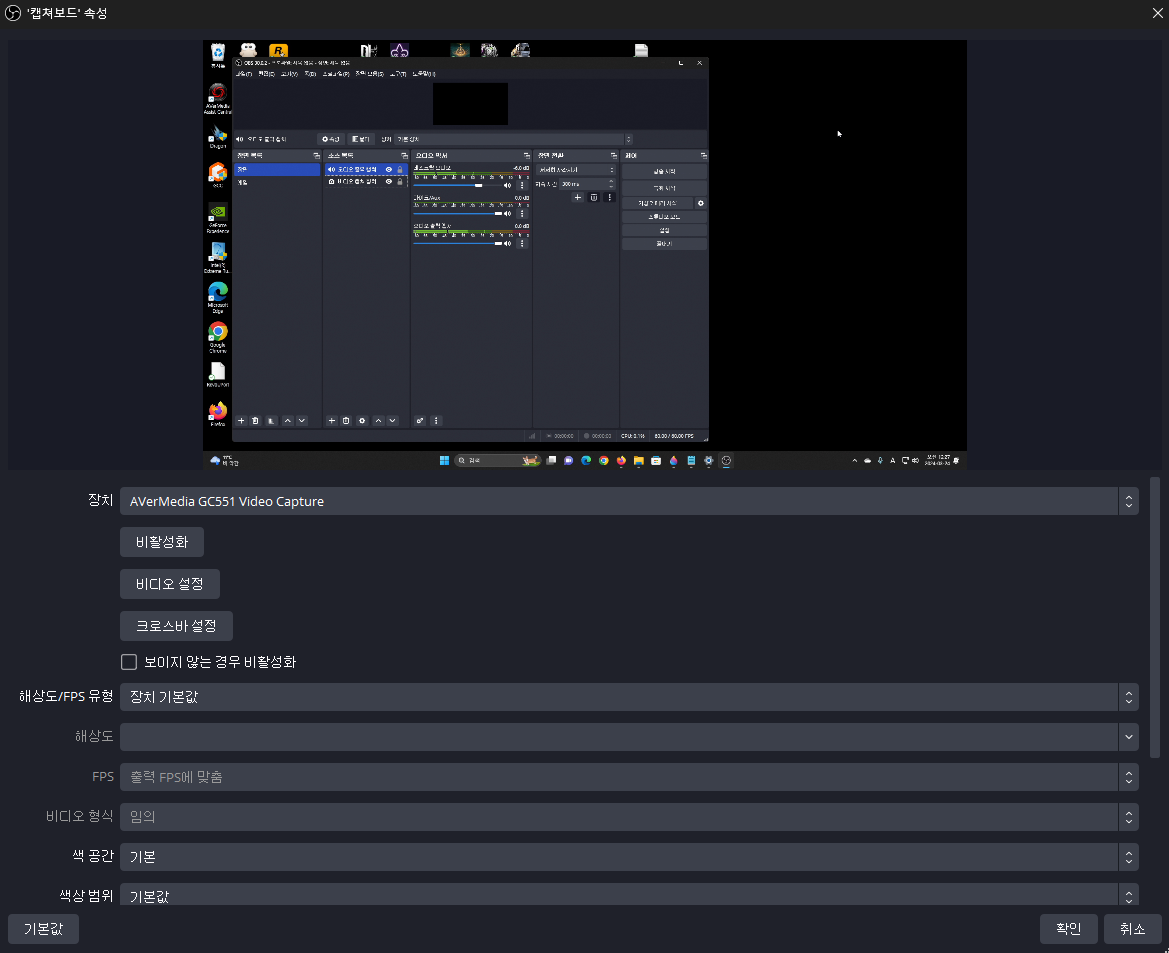 비디오 캡쳐 장치에서는 장치를 캡쳐보드로 설정해 주고