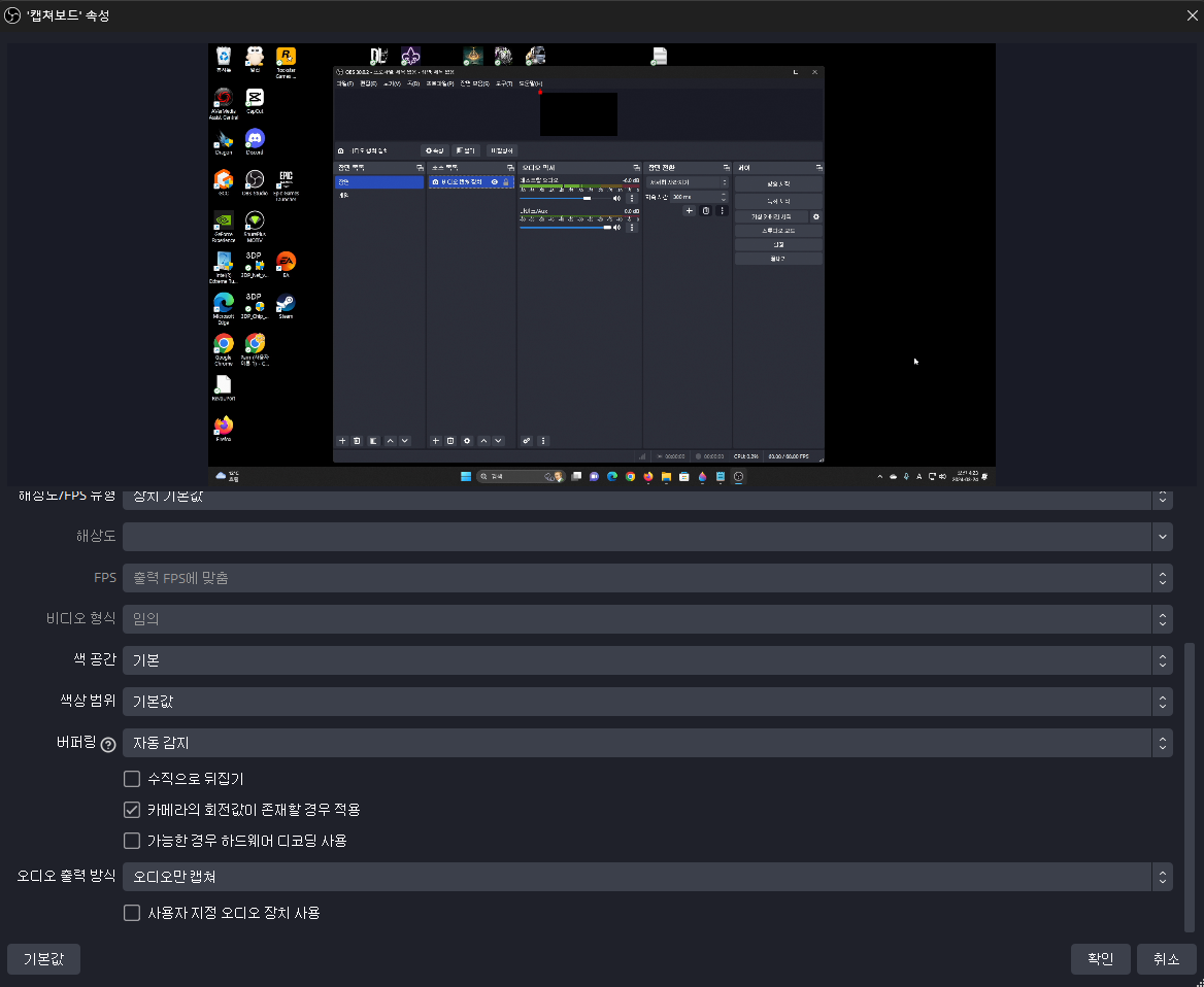스크롤 내려서 오디오 출력방식을 오디오만 캡쳐로 그대로 둔다..